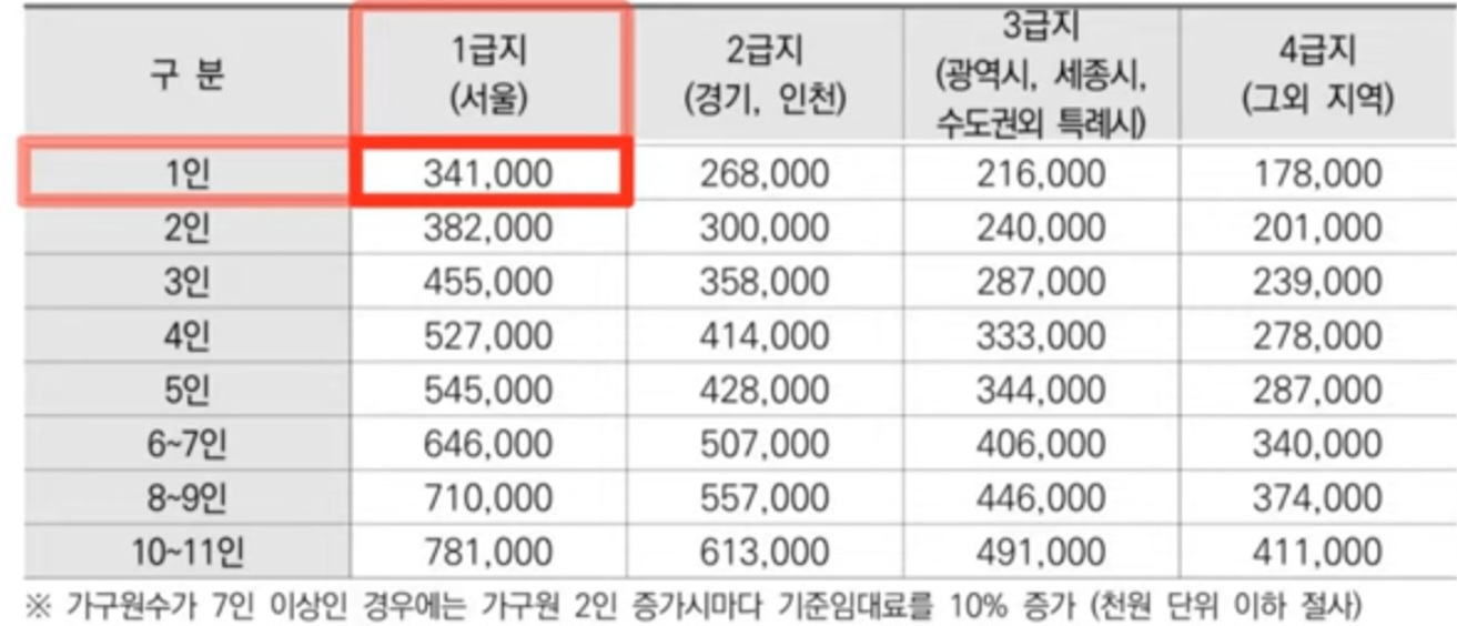 예= 서울 1인 임대료 50만원에 거주한다면 임차료 지원은 341,000원을 지원합니다